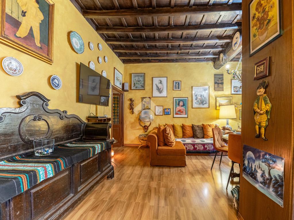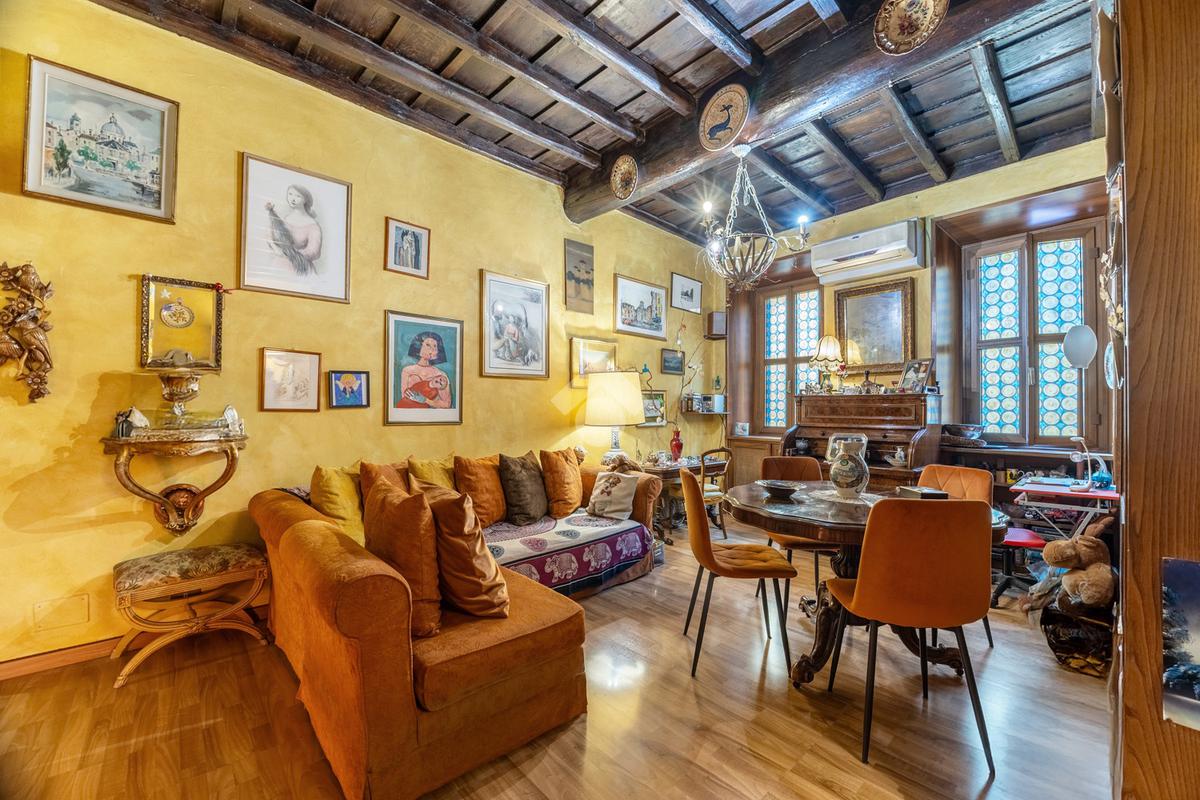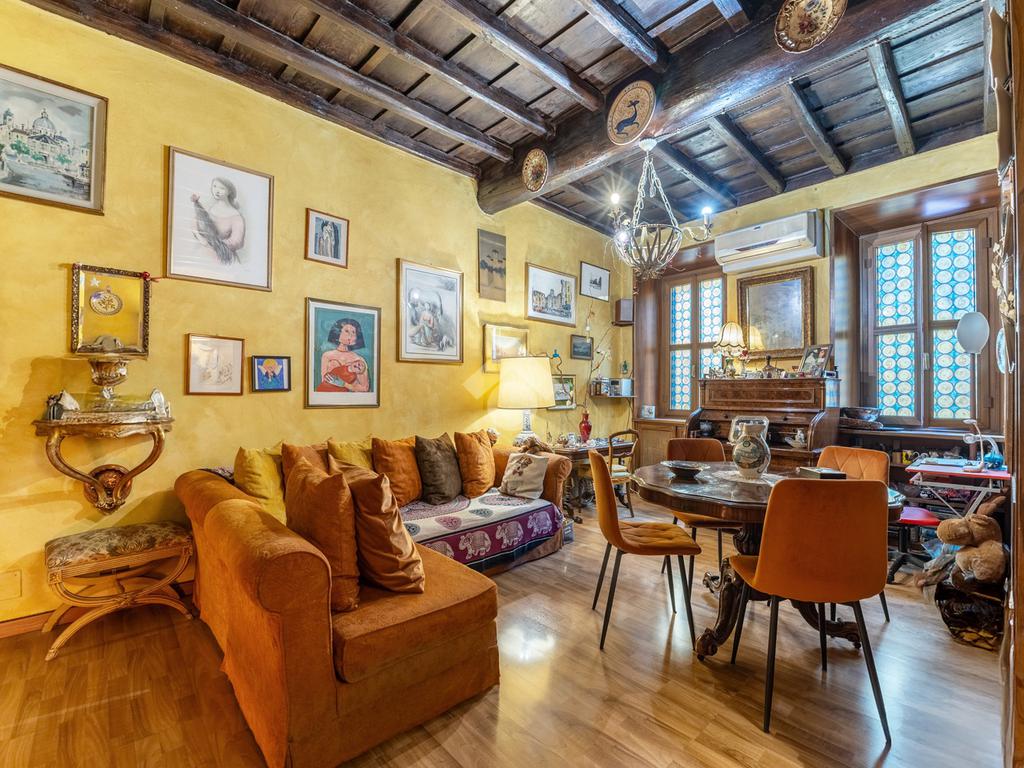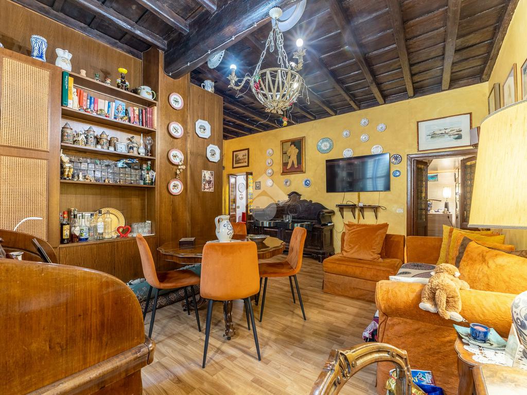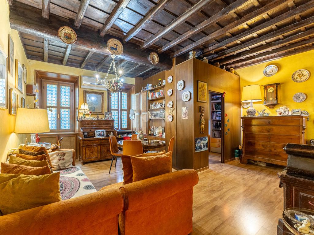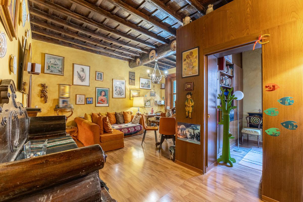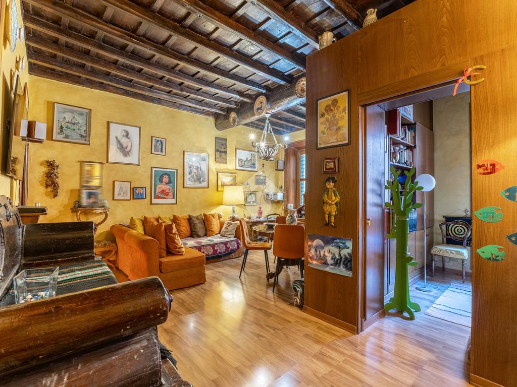 L’appartamento unisce elementi tipici delle abitazioni storiche (come travi in legno a vista e parquet) ad una buona distribuzione degli spazi con ingresso, salone con due finestre, camera matrimoniale, seconda camera, servizio finestrato, angolo cottura e ripostigli si presenta in buono stato di manutenzione e si presta perfettamente sia come abitazione principale, per chi desidera vivere il centro storico senza rinunciare alla tranquillità, sia come investimento di valore in una delle zone più richieste e stabili del mercato romano.